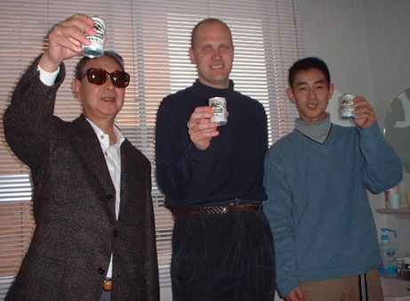 Keimei, Darren & Shogo do Kompai (cheers) to Anna with the mini Kirin beers.